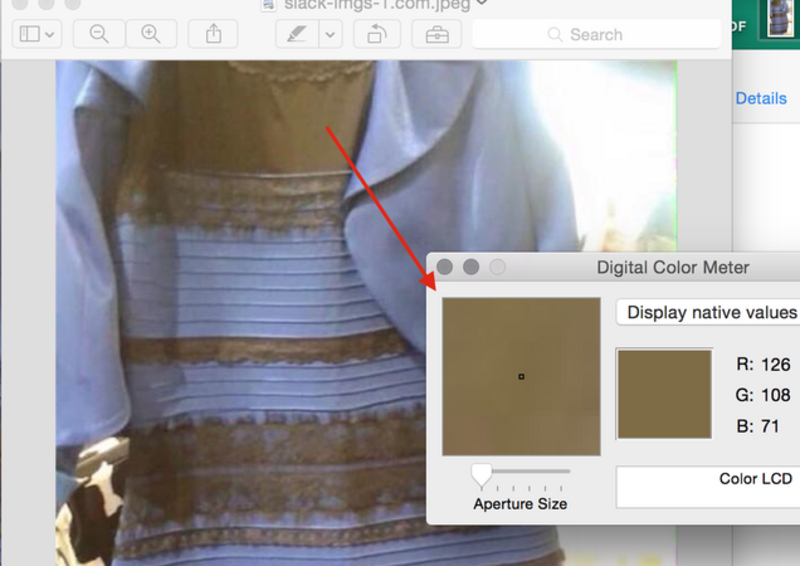 Here is another photograph of the dress in question (purportedly). This plainly appears to me to be black and blue; the photograph above, however, appears to me to be white—or very, very light blue—and gold.