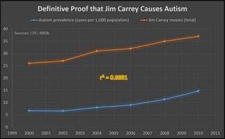 Kinja has shrunk it so in case you can’t read: the orange lines is the total number of Jim Carrey movies the blue line is cases of Autism per 1000.