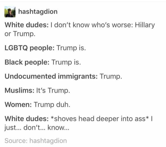 What’s the deal with the polling though? Are there really that many committed idiots out there? (Yes, obviously). At least Hillary is ahead this week, but not really by that much considering . . .