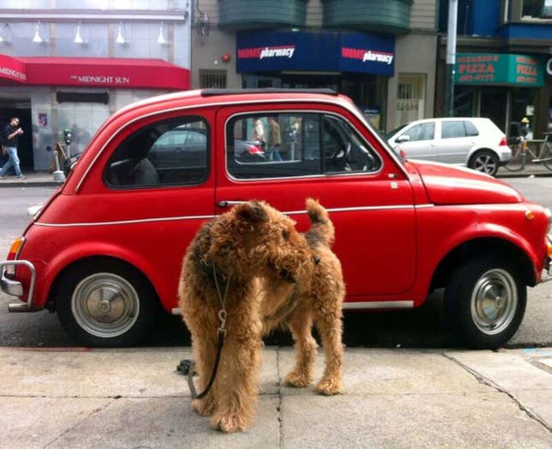Dear Diane, that sculpture does not look like lipstick. It looks like my dog's dick when he's got an erection. No erection photo, but here's Fred the Airedale, dwarfing a Fiat 500 in the Castro.